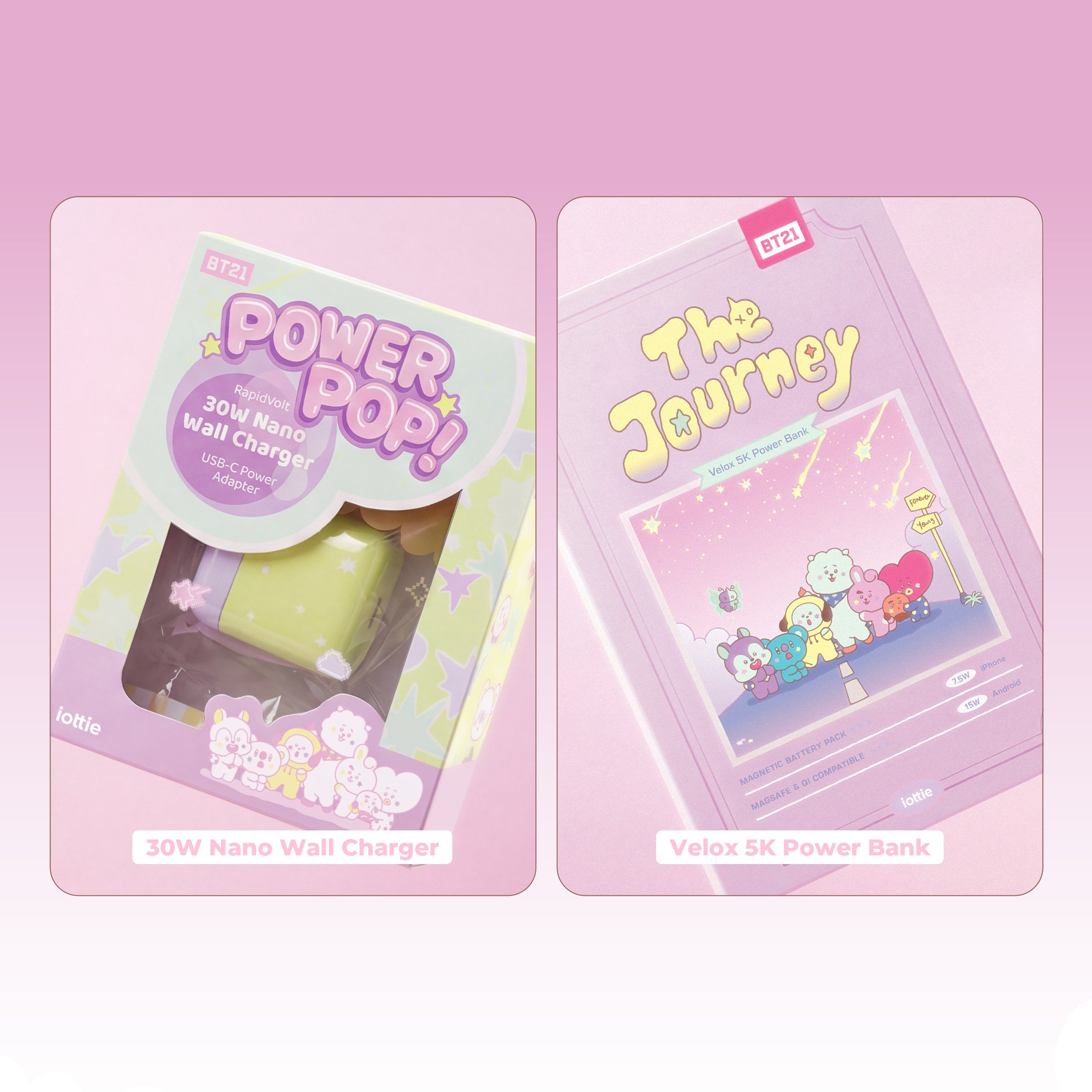 Unwrap the ultimate charging duo with the Velox 5K Power Bank and RapidVolt 30W Nano Wall Charger. The Velox snaps onto your MagSafe or Qi-compatible phone for fast charging, with an LED display, iridescent finish, beaded charm, and BT21 stickers. The candy-sized RapidVolt delivers fast, efficient GaN III charging on the go, with folding prongs, a USB-C port, and pastel two-toned design for a pop of playful personality. Together, they make an iconic charging combination.